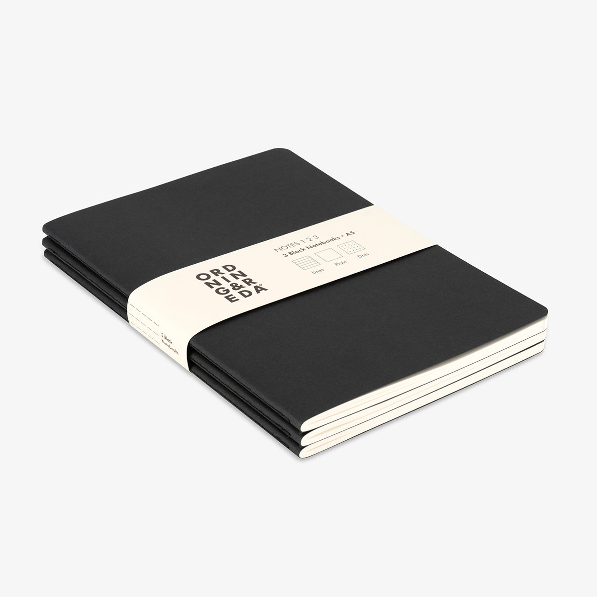 Set of three A5 notebooks with stitching on the spine (1 plain + 1 lines + 1 dotes)